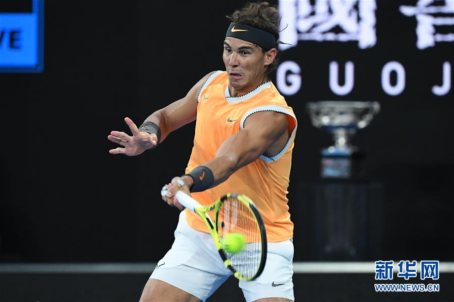 1月27日,纳达尔在比赛中回球。 当日,在2019年澳大利亚网球公开赛男子单打决赛中,塞尔维亚选手焦科维奇对阵西班牙选手纳达尔。 新华社记者吕小炜摄