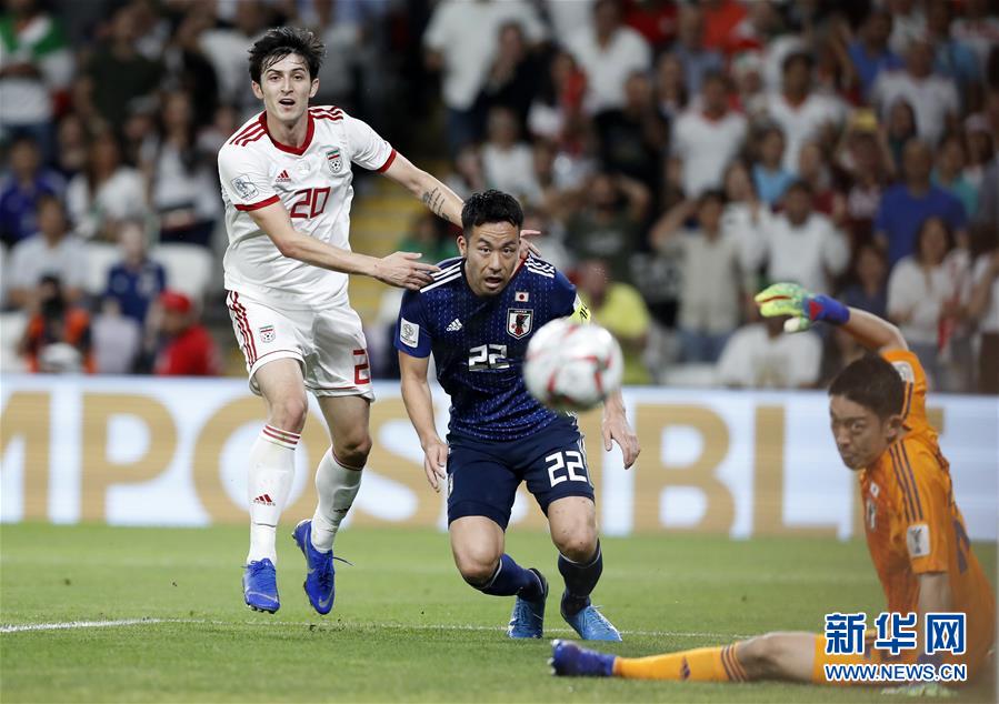 1月28日,日本队球员吉田麻也(中)防守伊朗队球员萨达尔·阿兹蒙。 当日,在阿联酋艾因举行的2019年亚洲杯足球赛半决赛中,日本队以3比0战胜伊朗队,晋级决赛。 新华社记者丁旭摄
