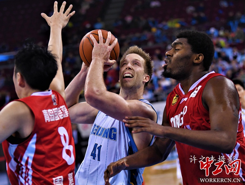 2019年1月29日晚,CBA联赛第37轮比赛,北京首钢队主场以102比90战胜青岛队。本赛季首钢队双杀对手。图为双方比赛瞬间。工人日报-中工网 许之丰摄影报道