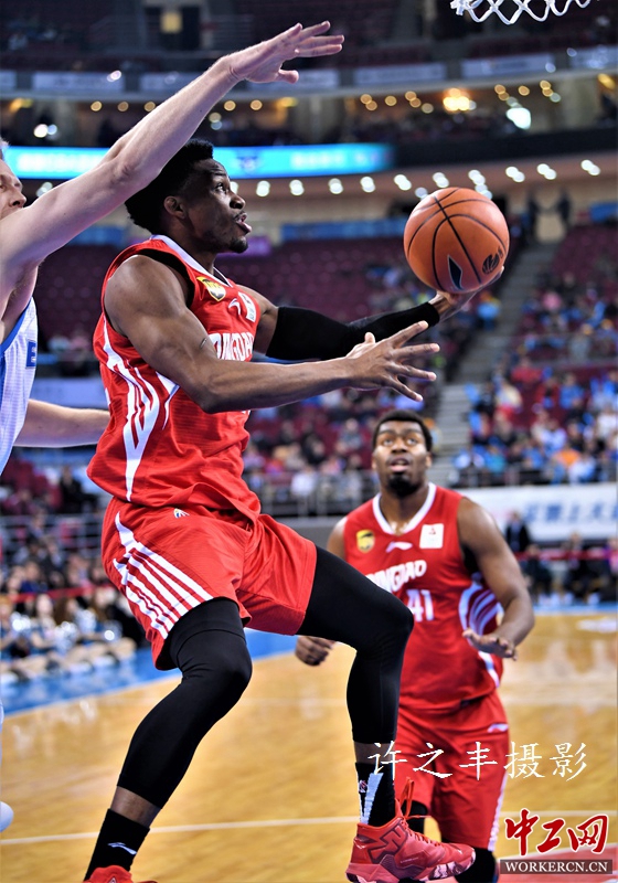 2019年1月29日晚,CBA联赛第37轮比赛,北京首钢队主场以102比90战胜青岛队。本赛季首钢队双杀对手。图为双方比赛瞬间。工人日报-中工网 许之丰摄影报道
