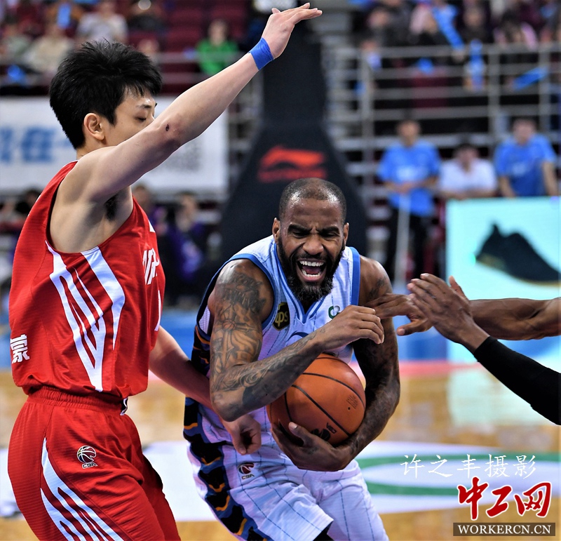 2019年1月29日晚,CBA联赛第37轮比赛,北京首钢队主场以102比90战胜青岛队。本赛季首钢队双杀对手。图为双方比赛瞬间。工人日报-中工网 许之丰摄影报道