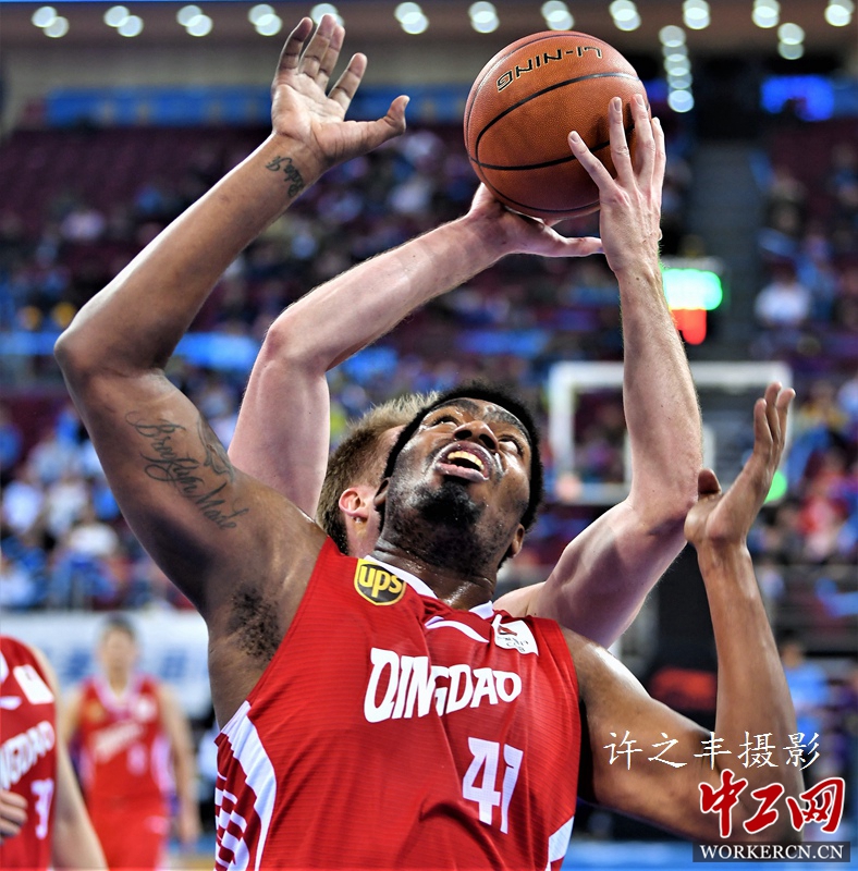 2019年1月29日晚,CBA联赛第37轮比赛,北京首钢队主场以102比90战胜青岛队。本赛季首钢队双杀对手。图为双方比赛瞬间。工人日报-中工网 许之丰摄影报道