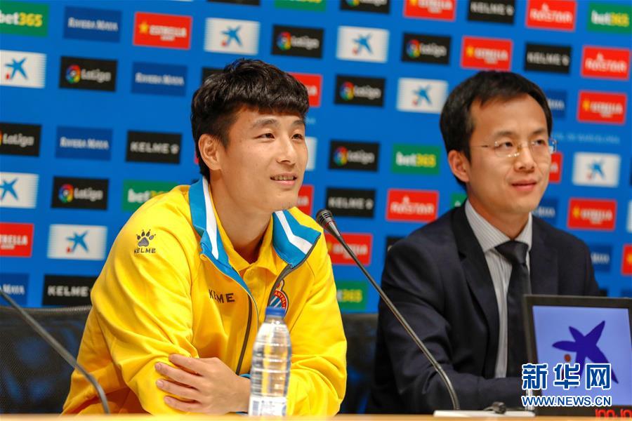 1月29日,武磊(左)在西班牙人俱乐部举行的媒体见面会上。 当日,加盟西甲西班牙人俱乐部的中国球员武磊首次在巴塞罗那与媒体及球迷见面。 新华社发(胡安·戈萨 摄)