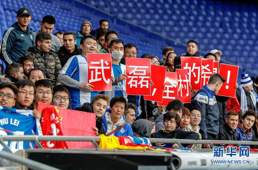 1月29日,球迷到西班牙人队主场为武磊加油。 当日,加盟西甲西班牙人俱乐部的中国球员武磊首次在巴塞罗那与媒体及球迷见面。 新华社发(胡安·戈萨 摄)
