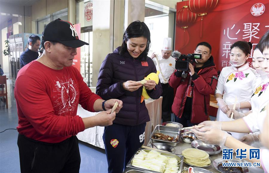 1月29日,国家游泳队运动员刘湘(中)制作烤鸭卷饼,准备品尝全聚德烤鸭。 为备战东京奥运会,国家各运动队400多名运动员和教练员将在春节期间留守北京继续训练。为了能让他们好好过年,来自全聚德和平门店的11位大厨和4位服务师来到国家体育总局训练局,用北京传统美食——烤鸭为大家献上一顿精美的新春大餐。 新华社记者李俊东摄