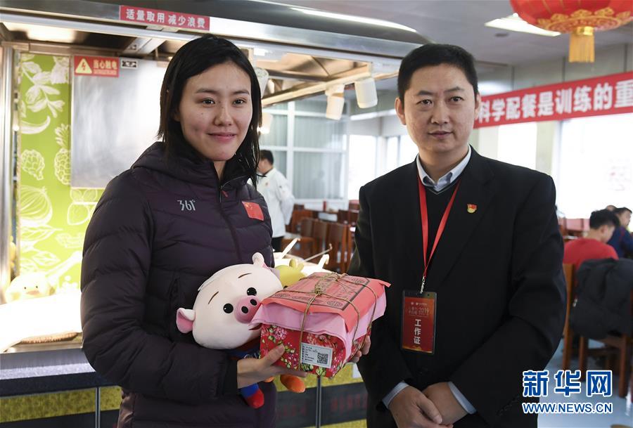 1月29日,国家游泳队运动员刘湘(左)展示全聚德赠送的新春礼物。 为备战东京奥运会,国家各运动队400多名运动员和教练员将在春节期间留守北京继续训练。为了能让他们好好过年,来自全聚德和平门店的11位大厨和4位服务师来到国家体育总局训练局,用北京传统美食——烤鸭为大家献上一顿精美的新春大餐。 新华社记者李俊东摄