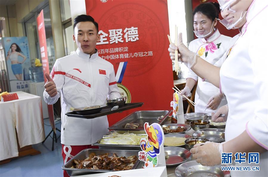 1月29日,国家体操队运动员肖若腾(左)品尝烤鸭后竖起大拇指。 为备战东京奥运会,国家各运动队400多名运动员和教练员将在春节期间留守北京继续训练。为了能让他们好好过年,来自全聚德和平门店的11位大厨和4位服务师来到国家体育总局训练局,用北京传统美食——烤鸭为大家献上一顿精美的新春大餐。 新华社记者李俊东摄