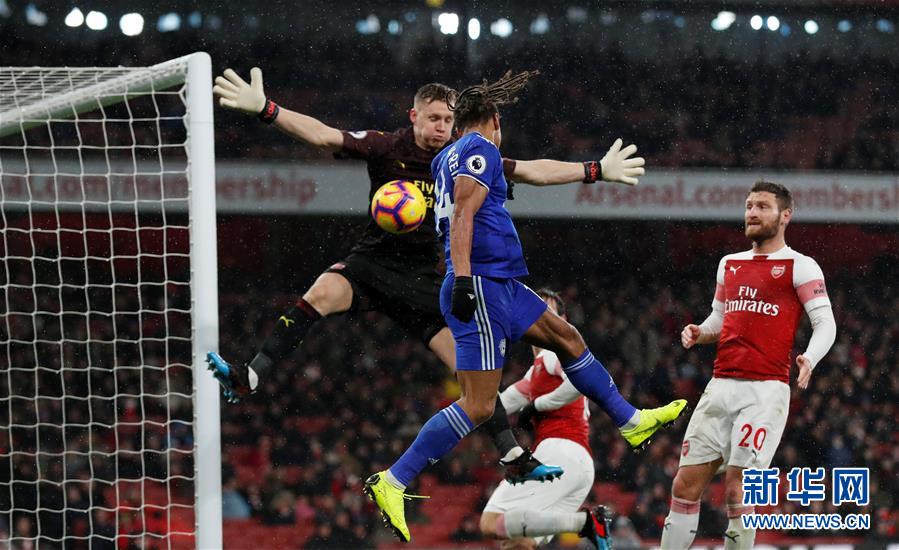 1月29日,阿森纳队门将莱诺(左)在比赛中防守卡迪夫城队球员雷德的头球。 当日,在2018-2019赛季英超足球联赛第24轮比赛中,阿森纳队主场以2比1战胜卡迪夫城队。 新华社/路透