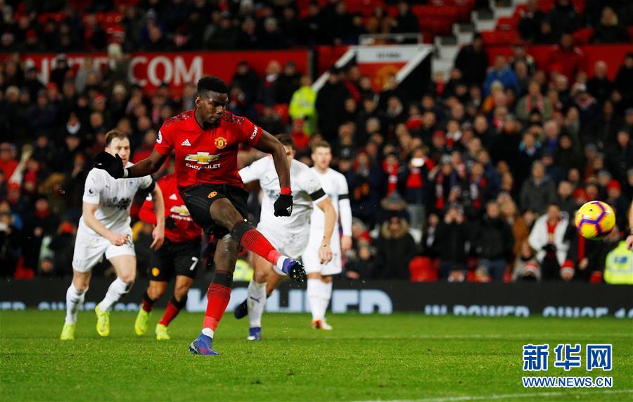 1月29日,曼联队球员博格巴(前)在比赛中射门得分。 当日,在2018-2019赛季英超足球联赛第24轮比赛中,曼彻斯特联队主场以2比2战平伯恩利队。 新华社/路透