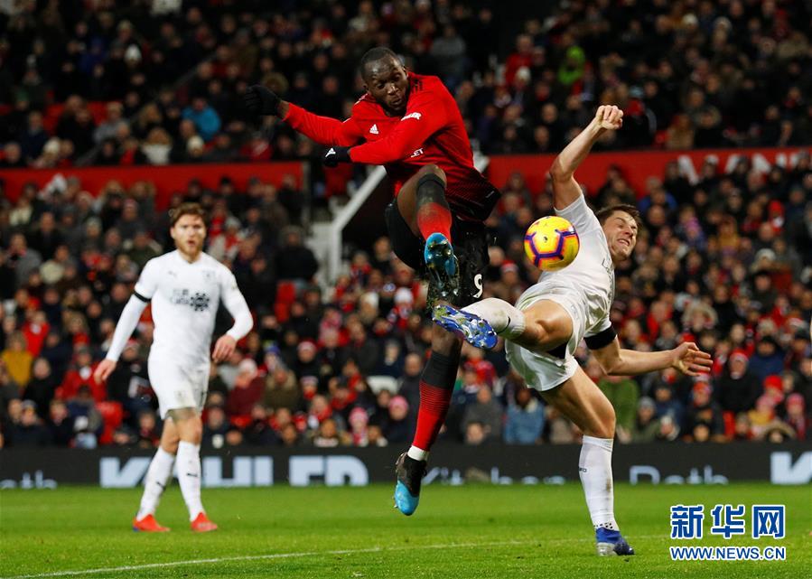 1月29日,曼联队球员卢卡库(中)在比赛中射门。 当日,在2018-2019赛季英超足球联赛第24轮比赛中,曼彻斯特联队主场以2比2战平伯恩利队。 新华社/路透