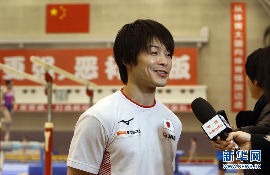 1月30日,日本体操男队队员内村航平在训练结束后接受采访。 当日,日本体操男队在国家体育总局训练局体操馆与中国体操男队共同进行训练,这是中日体操男队的首次共同训练。 新华社发(雒圆摄)