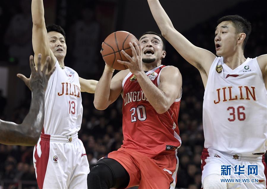 1月30日,时代中国广州队球员西热力江(中)在比赛中突破上篮。 当日,在2018-2019赛季中国男子篮球职业联赛(CBA)常规赛第37轮比赛中,吉林九台农商银行队主场以122比99战胜时代中国广州队。 新华社记者许畅摄