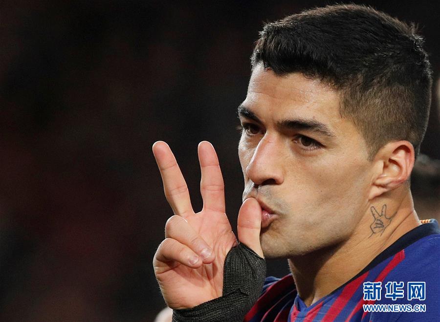 1月30日,巴塞罗那队球员苏亚雷斯庆祝进球。 当日,在2018-2019赛季西班牙国王杯四分之一决赛中,巴塞罗那队主场以6比1战胜塞维利亚队。 新华社/路透