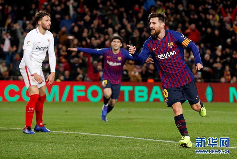 1月30日,巴塞罗那队球员梅西(右)庆祝进球。 当日,在2018-2019赛季西班牙国王杯四分之一决赛中,巴塞罗那队主场以6比1战胜塞维利亚队。 新华社/路透