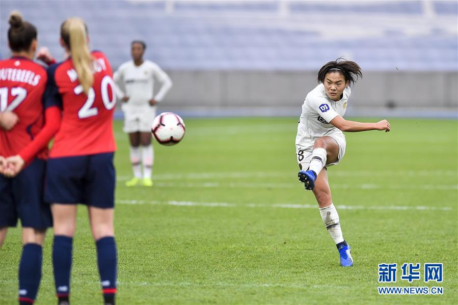 图为2019年1月13日,王霜在法国里尔举行的巴黎圣日耳曼对里尔的比赛中罚任意球。 新华社记者陈益宸摄