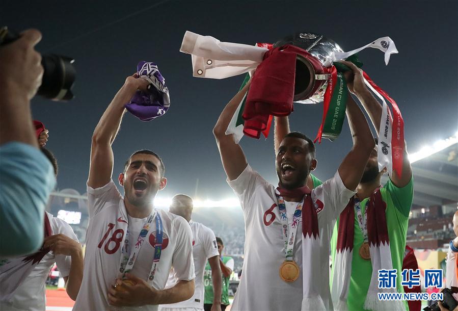 2月1日,卡塔尔队球员在比赛后庆祝。 当日,在阿联酋的阿布扎比举行的2019亚洲杯足球赛决赛中,卡塔尔队以3比1战胜日本队,夺得冠军。 新华社记者曹灿摄