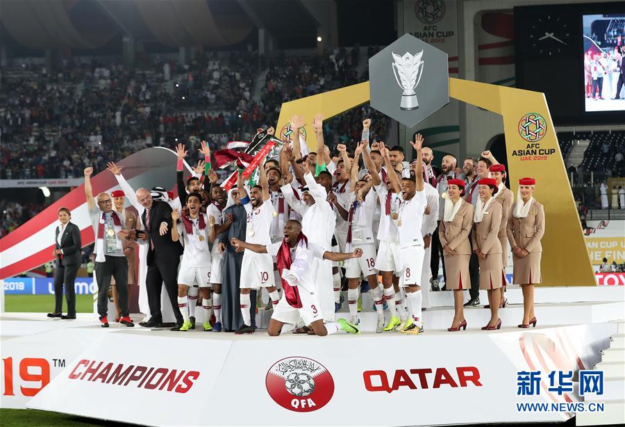 2月1日,卡塔尔队在颁奖仪式上庆祝夺冠。 当日,在阿联酋的阿布扎比举行的2019亚洲杯足球赛决赛中,卡塔尔队以3比1战胜日本队,夺得冠军。 新华社记者李钢摄