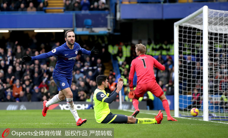 人民网北京2月3日电(杨磊) 北京时间2月2日晚,2018/19赛季英超第25轮展开争夺,切尔西主场5比0大胜哈德斯菲尔德,伊瓜因和阿扎尔梅开二度,路易斯锦上添花。切尔西重回前四。
