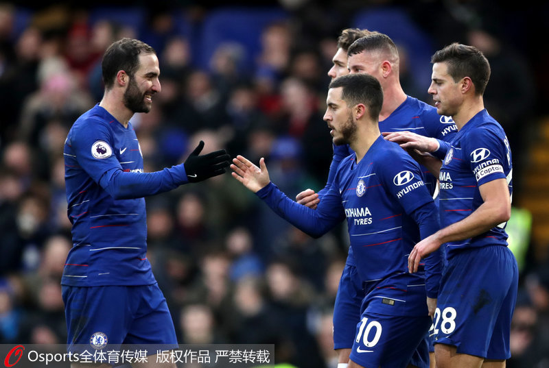 英超-伊瓜因、阿扎尔梅开二度 切尔西5-0大胜哈镇