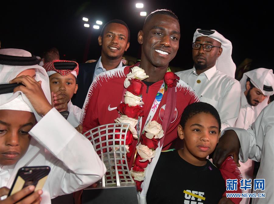 2月2日,2019年亚洲杯最有价值球员阿尔莫伊兹·阿里(中)在机场留影。 当日,首次夺得亚洲杯冠军的卡塔尔国家足球队返回卡塔尔首都多哈,受到隆重欢迎。 新华社发(尼库摄)