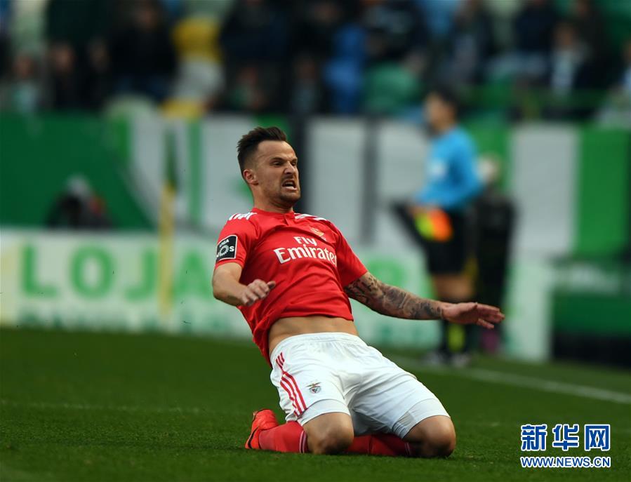 ↑2月3日,本菲卡队球员塞费罗维奇在进球后庆祝。 当日,在葡萄牙首都里斯本举行的2018-2019赛季葡萄牙足球超级联赛第20轮比赛中,本菲卡队客场以4比2战胜葡萄牙体育队。 新华社记者张立云摄