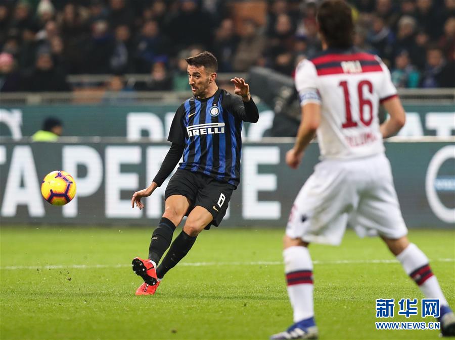2月3日,国际米兰队球员贝西诺(左)在比赛中进攻。 当日,在2018-2019意大利足球甲级联赛第22轮比赛中,国际米兰队主场以0比1不敌博洛尼亚队。 本场比赛北京时间恰逢中国传统节日除夕,国际米兰队球员身穿特别款、印有中文名字的球衣登场庆祝中国春节。 新华社记者程婷婷摄