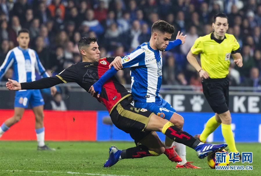 2月9日,西班牙人队球员奥斯卡·米伦多(右)和巴列卡诺队球员贝拉斯克斯(左)在比赛中拼抢。 当日,在2018-2019赛季西班牙足球甲级联赛第23轮比赛中,西班牙人队主场2比1战胜巴列卡诺队。 新华社发(胡安·戈萨摄)