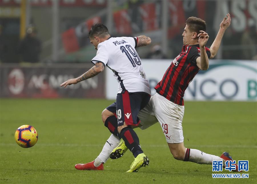 AC米兰队球员皮亚特克(右)与卡利亚里队球员皮萨卡内在比赛中拼抢。新华社/美联社