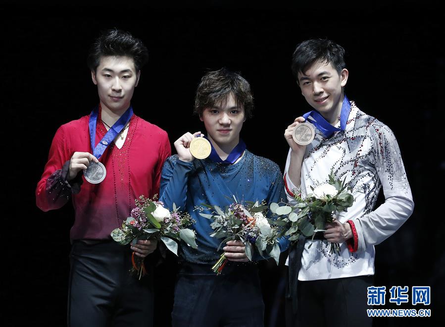 ↑2月9日,冠军日本选手宇野昌磨(中)、亚军中国选手金博洋(左)和季军美国选手周知方在领奖台上。 当日,在美国阿纳海姆举行的2019四大洲花样滑冰锦标赛男单比赛中,中国选手金博洋以273.51分的总成绩获得亚军。 新华社发(赵汉荣摄)