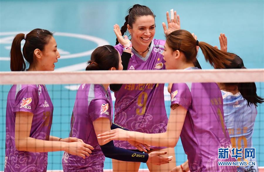 2月12日,天津渤海银行队球员茨尔恩切维奇(中)和队友在比赛中庆祝得分。 当日,在2018-2019赛季中国女排超级联赛第三阶段(半决赛)第一轮比赛中,天津渤海银行队主场以3比1战胜江苏中天钢铁队。 新华社记者李然摄
