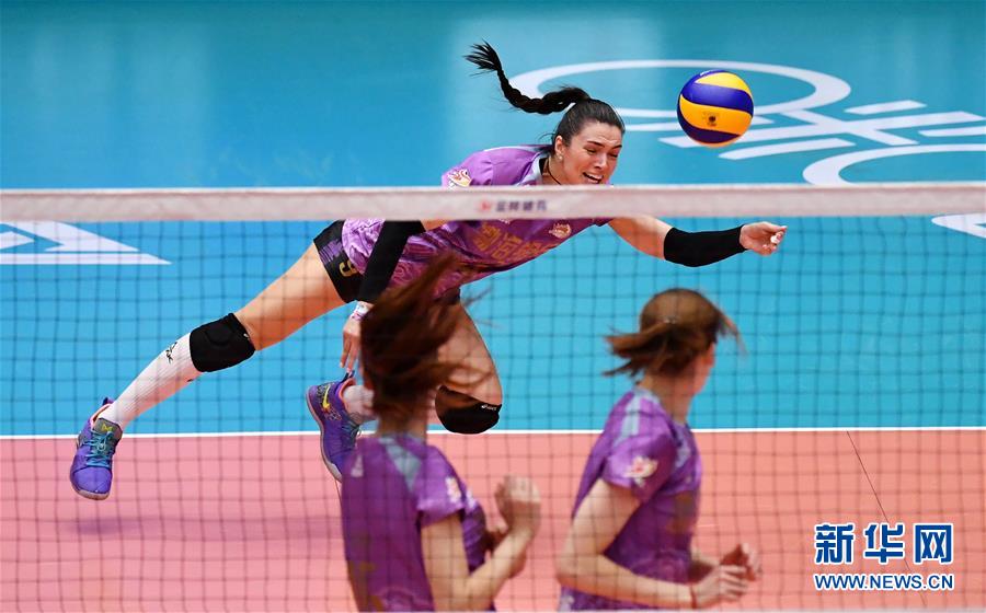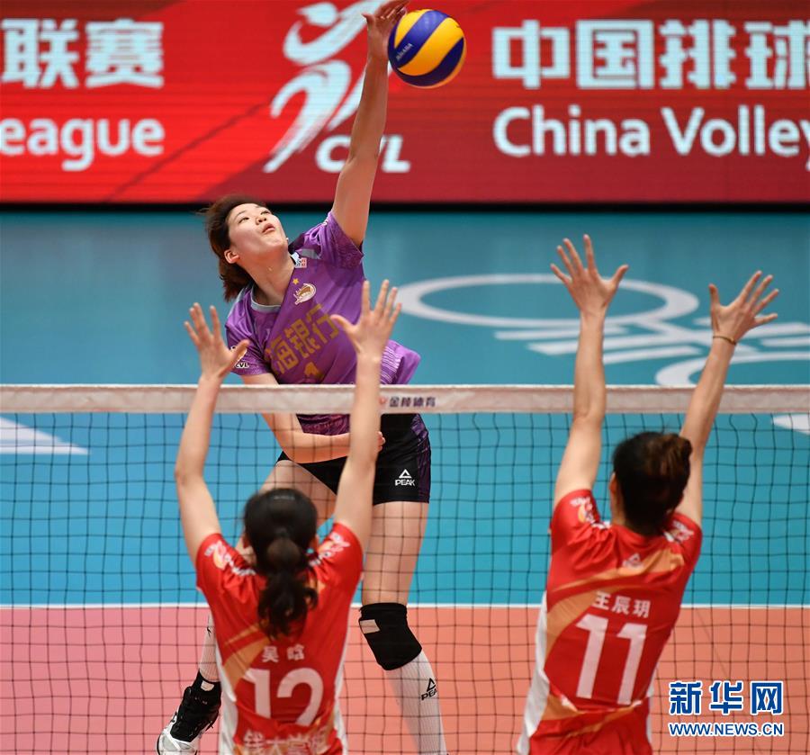 天津渤海银行队球员李盈莹(上)在比赛中扣球。新华社记者李然摄