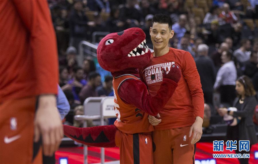 猛龙队球员林书豪(右)赛前与猛龙队吉祥物拥抱。新华社发(邹峥摄)