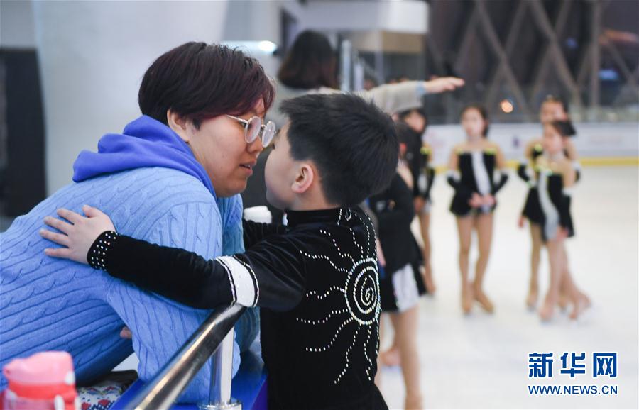 2月14日,在福建省福州市世纪星滑冰场,队列滑中唯一的小男生在休息时和妈妈说悄悄话。 新华社记者宋为伟摄