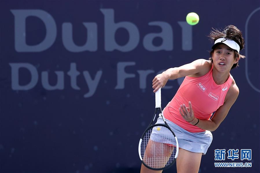 张帅在比赛中发球。 当日,在2019年WTA迪拜网球赛女单首轮比赛中,中国选手张帅以2比0战胜爱沙尼亚选手康塔维特,晋级第二轮。 新华社发