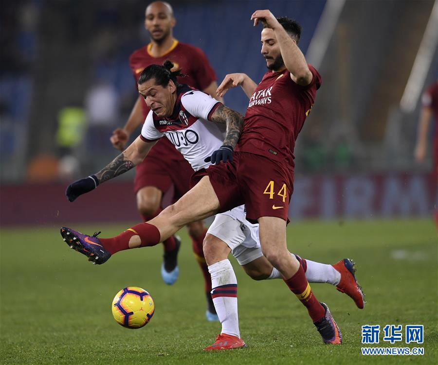罗马队球员马诺拉斯(右)与博洛尼亚队球员桑坦德在比萨中拼抢。新华社发