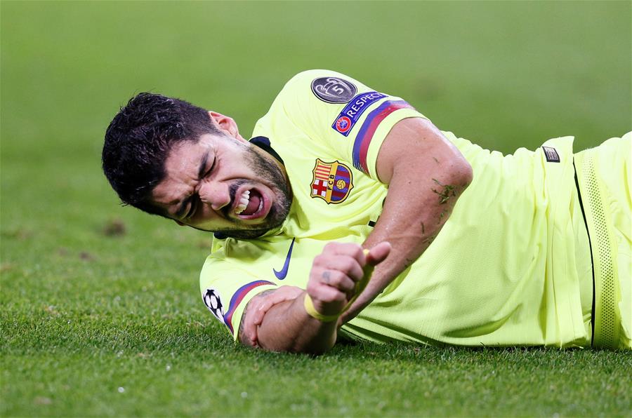 巴塞罗那队球员苏亚雷斯在比赛中。 当日,在2018-2019赛季欧洲足球冠军联赛八分之一决赛首回合比赛中,巴塞罗那队客场以0比0战平里昂队。 新华社/路透社