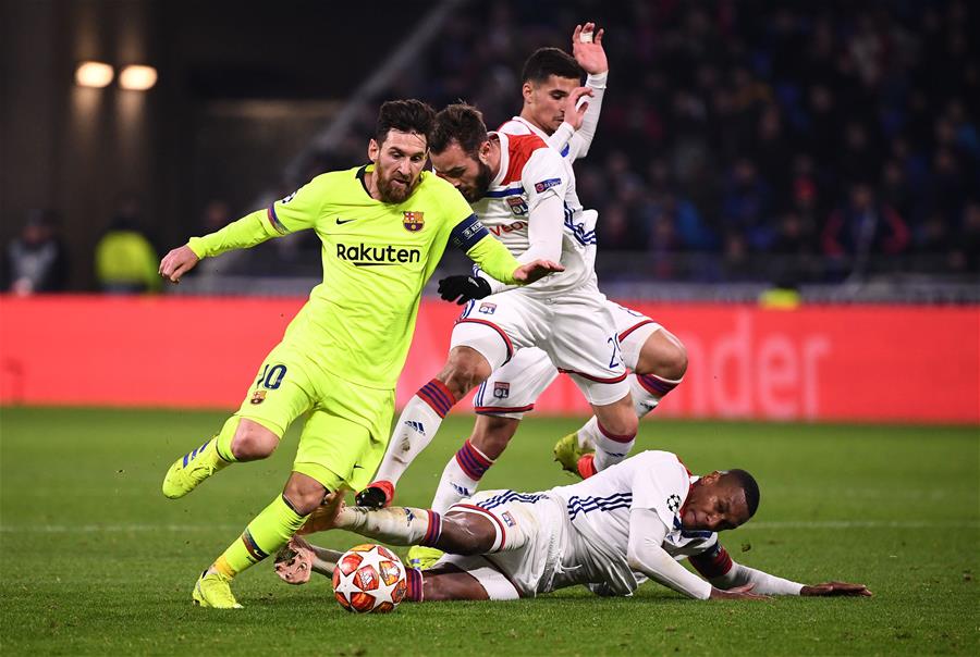 巴塞罗那队球员梅西(左)在比赛中突破。 当日,在2018-2019赛季欧洲足球冠军联赛八分之一决赛首回合比赛中,巴塞罗那队客场以0比0战平里昂队。 新华社/法新社
