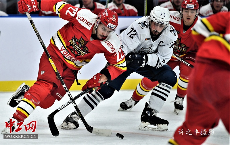 中工网讯 2019年2月20日晚,在北京2022奥运会首钢冰球馆,2018-2019赛季KHL大陆冰球联赛,由中国国际文化传播中心主管的北京昆仑鸿星万科龙队迎战俄罗斯海军上将队。凭借中国球员的出色表现,队长叶劲光攻入一球,英如镝攻入中国本土球员第一球,外援帕罗拉打入两球,沃尔斯基和肖尔各入一球,最终昆仑鸿星万科龙队以6比3战胜海军上将队。图为双方的比赛。工人日报-中工网 许之丰摄影报道