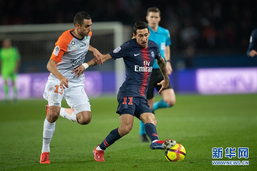 2月20日,巴黎圣日耳曼队球员迪马利亚(右)与蒙彼利埃队球员斯希里在比赛中拼抢。 当日,在2018-2019赛季法国足球甲级联赛第17轮比赛中,巴黎圣日耳曼队主场以5比1战胜蒙彼利埃队。 新华社发(杰克·陈摄)