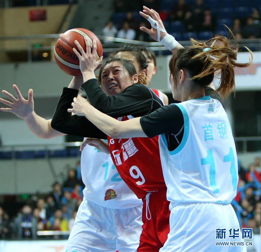 新疆体彩队球员彭诗晴(前左)在比赛中突破上篮。新华社发(雒圆摄)