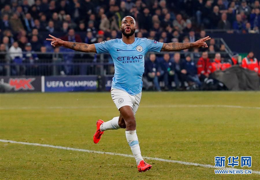 2月20日,曼城队球员斯特林在比赛中庆祝进球。 当日,在2018-2019赛季欧冠联赛八分之一决赛首回合比赛中,曼城队客场以3比2战胜沙尔克04队。 新华社/路透社