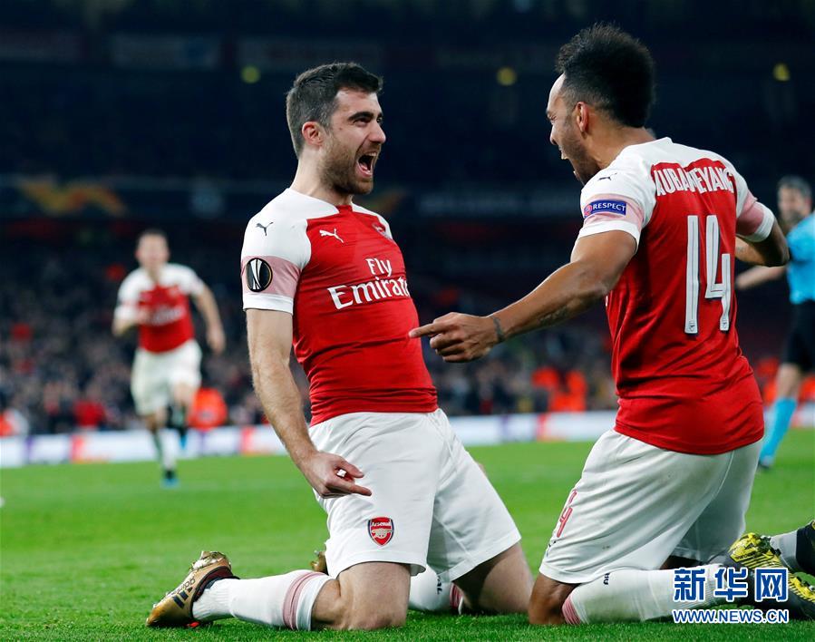 2月21日,阿森纳队球员帕帕斯塔索普洛斯(左)与奥巴梅扬在比赛中庆祝进球。 当日,在2018-2019赛季欧罗巴足球联赛十六分之一决赛第二回合比赛中,阿森纳队主场以3比0战胜鲍里索夫队,以两回合3比1的总比分晋级16强。 新华社/路透社