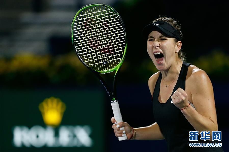 2月21日,本西奇在比赛后庆祝。 当日,在2019年WTA迪拜网球赛女单四分之一决赛中,瑞士选手本西奇以2比1战胜罗马尼亚选手哈勒普,晋级半决赛。 新华社发