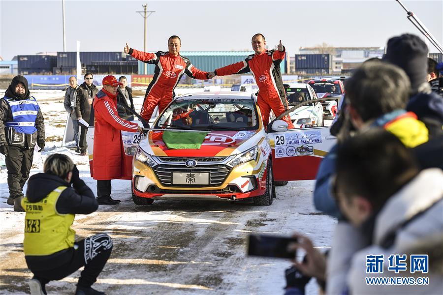 比亚迪车队车手张红智(右上)和领航员董晓刚(左上)在发车仪式上。新华社记者夏一方摄