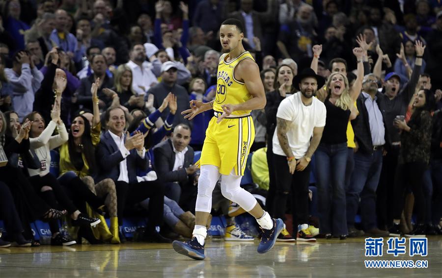 勇士队球员库里庆祝命中三分球。新华社/美联社