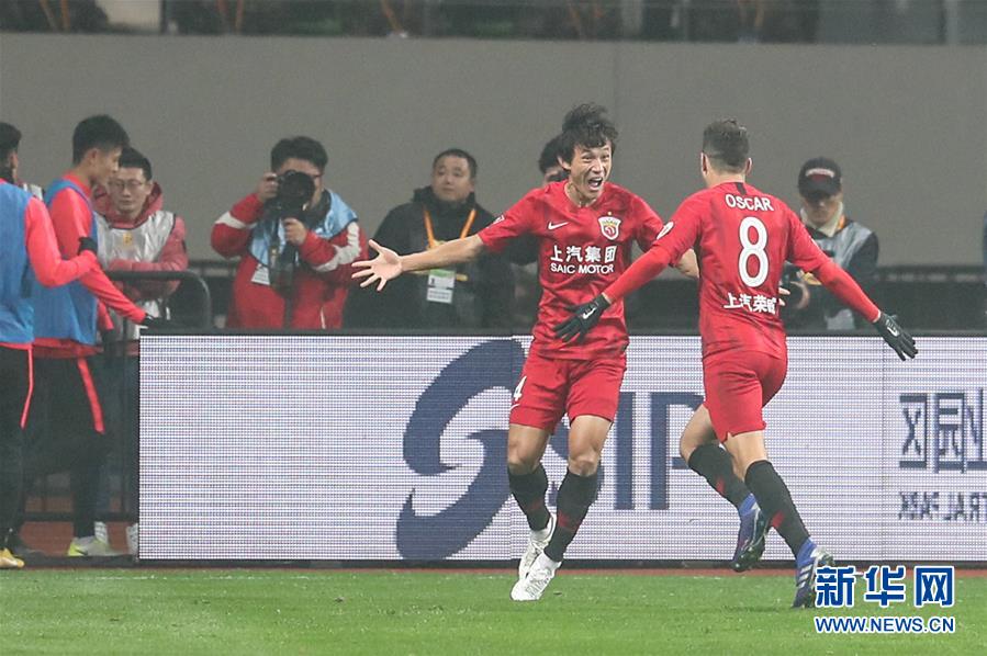 2月23日,上海上港队球员王燊超(前左)进球后与队友奥斯卡庆祝。 当日,在江苏苏州举行的2019中国足球协会超级杯赛中,上赛季中超联赛冠军上海上港队以2比0战胜足协杯冠军北京国安队,夺得冠军。 新华社记者 杨磊 摄