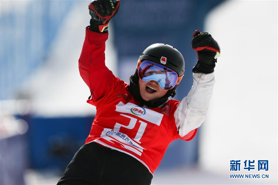 2月24日,中国选手宫乃莹在比赛中庆祝。 当日,在2018-2019国际雪联单板滑雪平行项目世界杯平行回转女子组决赛中,中国选手宫乃莹夺得冠军。 新华社发(雒圆摄)