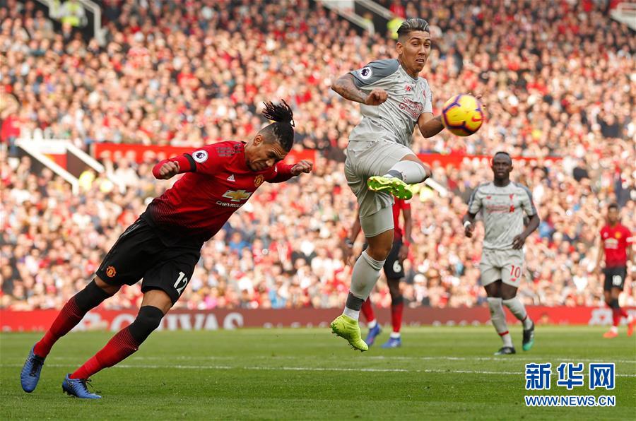 2月24日,曼联队球员斯莫林(左)与利物浦队球员菲尔米诺拼抢。 当日,在2018-2019赛季英格兰足球超级联赛第27轮比赛中,曼联队主场以0比0战平利物浦队。 新华社/路透社