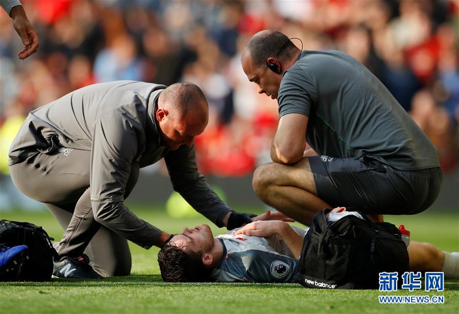 利物浦队球员罗伯逊(下)在比赛中受伤接受治疗。新华社/路透社