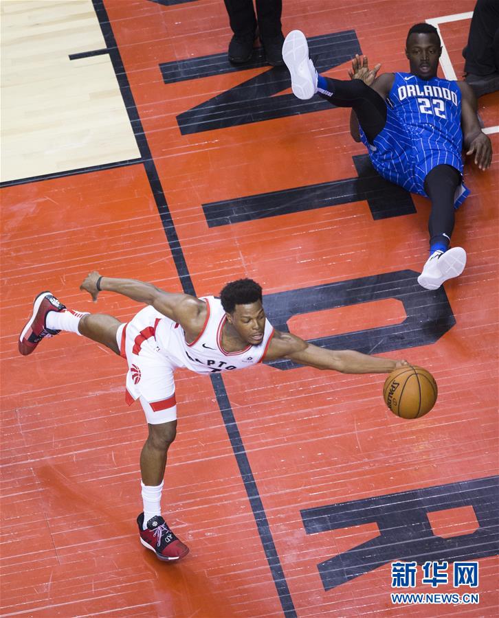 2月24日,猛龙队球员凯尔·洛瑞(下)在比赛中救球。 当日,在2018-2019赛季NBA常规赛中,多伦多猛龙队主场以98比113不敌奥兰多魔术队。 新华社发(邹峥摄)